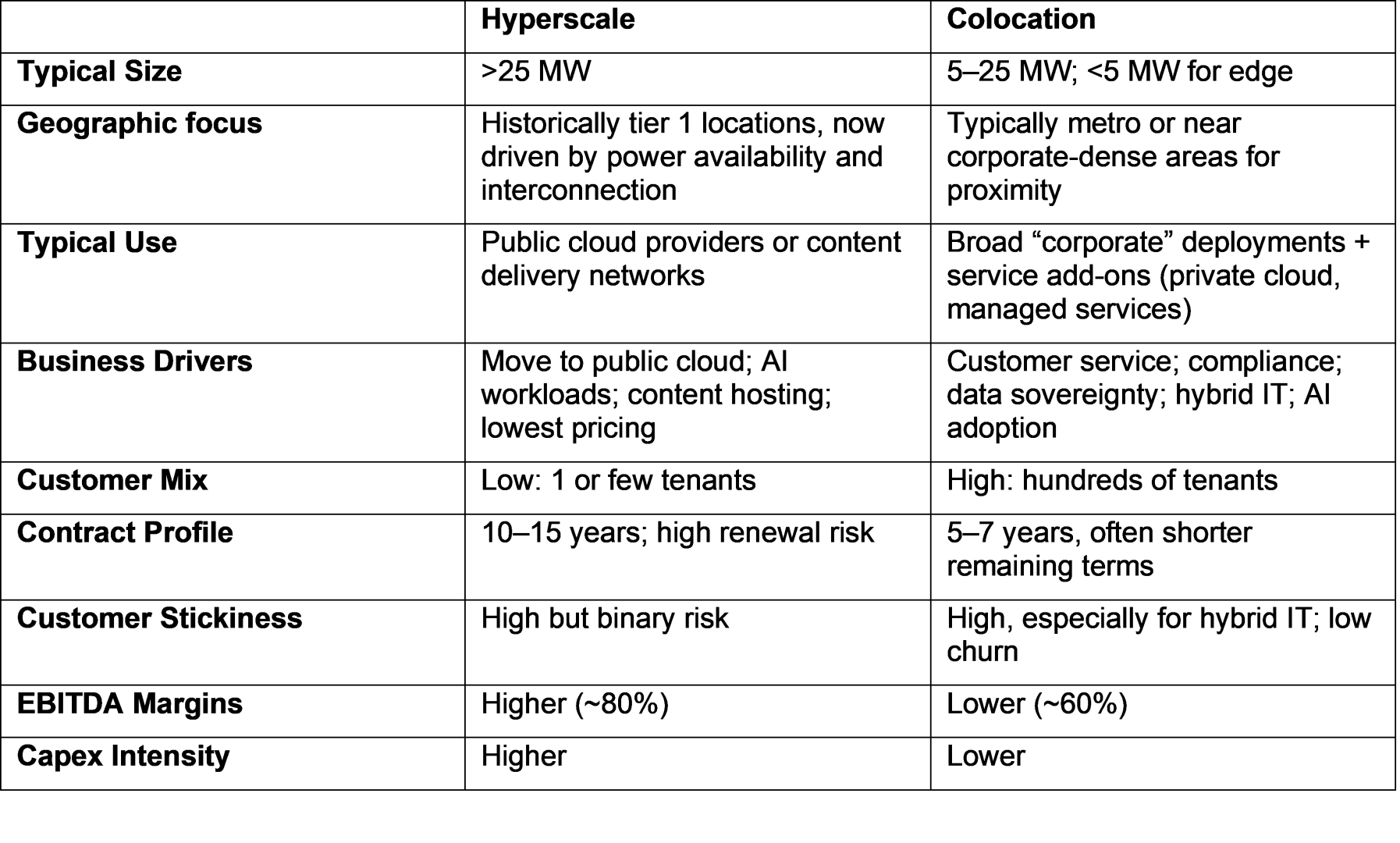Long-term contracts and bespoke, purpose-built designs make hyperscale tenant renewal “sticky”, especially given the strategic importance of these sites. Hyperscale data centres have higher operating margins than the industry average, driven by superior power density and occupancy, but high capex can cap overall profitability.