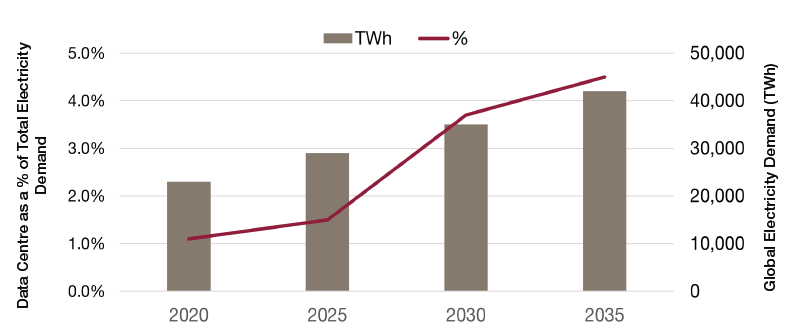 Data Centres, Electricity Consumption as a % of Global Electricity Consumption, TWh, %, 2020-2035